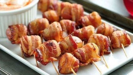 5. Фаршированный картофель обернуть беконом и закрепить деревянной шпажкой.