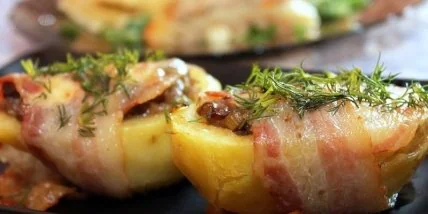Фаршированный картофель с сочной начинкой из шампиньонов и лука, обернутый беконом.