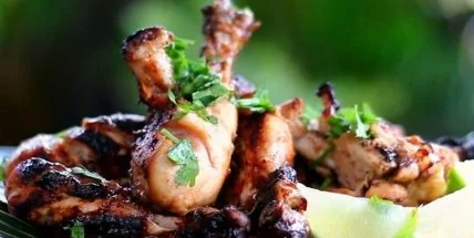 7. Выложить куриные ножки на блюдо, подавать с зеленью, овощами, томатным соусом и кусочками лайма.