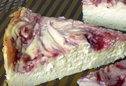 4. Вылить творожную смесь на корж, разровнять силиконовой лопаткой. Перелить малиновый джем в кондитерский мешок, сделать мраморные узоры на чизкейке.
