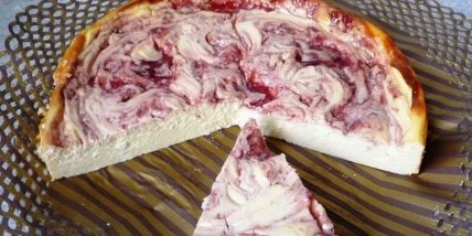4. Вылить творожную смесь на корж, разровнять силиконовой лопаткой. Перелить малиновый джем в кондитерский мешок, сделать мраморные узоры на чизкейке.