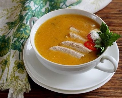 3. Затем вернуть кастрюлю на огонь, влить сливки и добавить специи по вкусу. Если суп получился густым, разбавить его горячим бульоном или водой до желаемой консистенции. Довести суп до кипения и выключить нагрев.