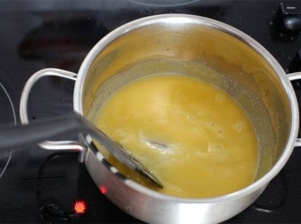 Вылить соус в форму для суфле. Отделить смесь от краев при помощи ножа. Это создаст эффект "цилиндра" и позволит суфле подняться. Поставить в духовку на 25-30 минут, пока суфле не поднимется и не образуется золотистая корочка.