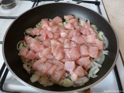 Куриное филе нарезаем на кусочки и добавляем к луку. Слегка обжариваем со всех сторон.