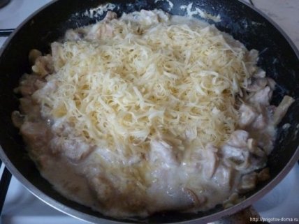 Готовый жульен из курицы посыпаем тертым сыром, перемешиваем и снимаем с огня.