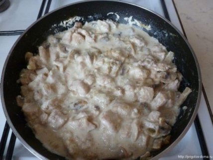 Далее добавляем сметану, перемешиваем и доводим до кипения. Вливаем в сковороду сливки. Периодически помешивая доводим до нужной консистенции. Жульен не должен быть слишком жидким. В противном случае начинка будет выливаться из блинчиков.