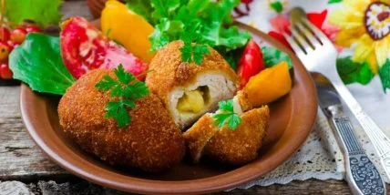 В начинке таких котлет есть не только сыр, но еще и яйца с зеленью, поэтому результат получится неимоверно вкусным. Такое мясное блюдо можно приготовить в любой день недели.
