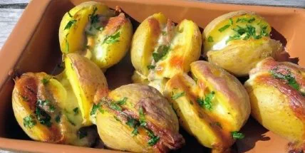 2 Картофель хорошо моем и отвариваем в воде с небольшим количеством соли почти до готовности. Выкладываем в форму и у каждой картошки делаем надрез (кармашек), не дорезая до конца.
