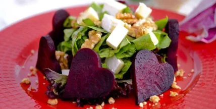 Салат на День святого Валентина: рецепт с зеленью, сыром и свекольными сердечками
