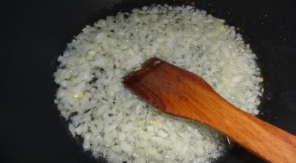 6 К бекону добавьте мелко нарезанный репчатый лук и обжарьте до прозрачности лука.