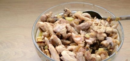 10 Соедините в миске курицу, грибы и картофель. Добавьте соль, перец, перемешайте.