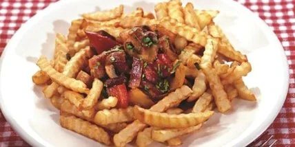 Хотим предложить вариант овощного ужина. Картошечка фри, приготовленная без масла в духовке, и очень сытное овощное жаркое.