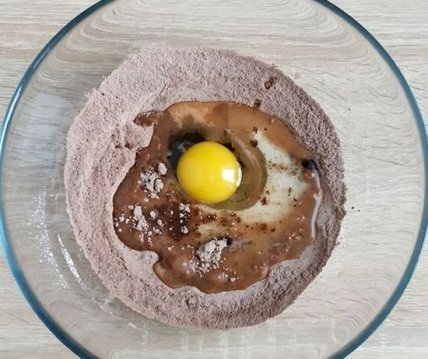 5. В смесь сухих ингредиентов добавьте яйцо, влейте молоко и подсолнечное рафинированное масло.