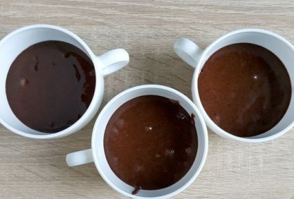 7. Разложите шоколадное тесто в чашки, занимая не более половины объема каждой из них. Объем используемой мною чашки составляет 230 мл.
