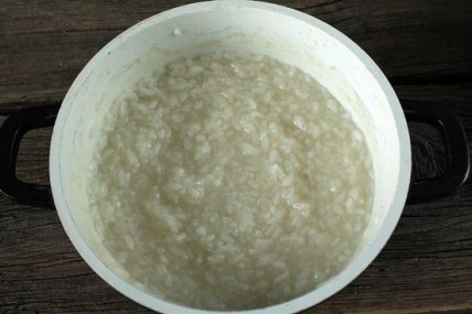 1 Рис промыть, залить водой и варить на среднем огне до готовности, даже лучше дольше, пока рис не начнет развариваться. Рис должен получится жидким, но крахмалистым.
