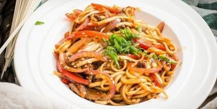 Ароматная свинина с лапшой в пикантном маринаде – отличный вариант для вкусного обеда или ужина в восточном стиле.