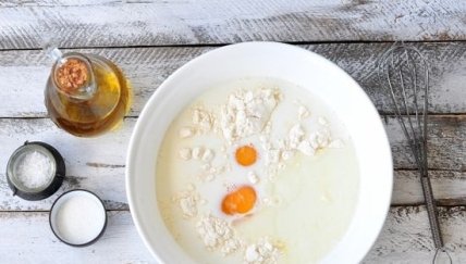 1 Готовим блинчики. Для этого разбиваем два куриных яйца, добавляем соль, сахар и хорошо работаем венчиком. После чего вливаем стакан молока и тоже хорошо все перемешиваем. Просеиваем муку с разрыхлителем, замешиваем тесто. В полученную массу постепенно добавляем крутой кипяток и хорошо вымешиваем тесто. В конце добавляем немного растительного масла (примерно 1 ст. ложку) и даем тесту отдохнуть минут 15.