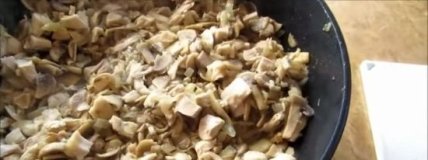 2 Шампиньоны нарезаем не мелко, чтобы они чувствовались в готовом блюде. Добавляем порезанные грибы к луку. Обжариваем, выпариваем лишнюю влагу.