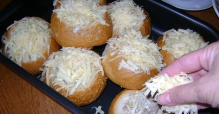 7 У булочек вырезаем верхушку (с помощью кухонных ножниц), мякоть придавливаем - делаем место для начинки.