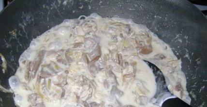 5 Самое время посолить и поперчить (учитывайте соленость вашего сыра). Добавляем сметану, натертый сыр, перемешиваем. И как только сыр начнет плавиться, выключаем нагрев (через 1-2 минуты).