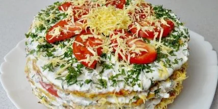 Закусочный торт из кабачковых блинчиков – интересная альтернатива печеночному.