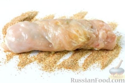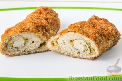 8 Затем запанируйте куриный рулет с сыром и зеленью в измельченных сухарях.