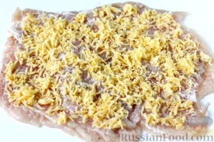 4 Натрите твердый сыр на мелкой терке и присыпьте им поверхность отбитого филе.