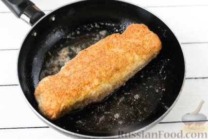 9 Обжарьте на сковороде в разогретом растительном масле до румяной корочки около 5 минут с каждой стороны на среднем нагреве. После этого поместите мясной рулет с сыром в духовку и запеките при 200 градусах еще 15-20 минут, до готовности.