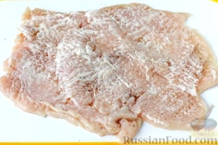 2 Отбейте филе, выложив пленочной стороной вниз. Посолите и поперчите отбитое мясо.