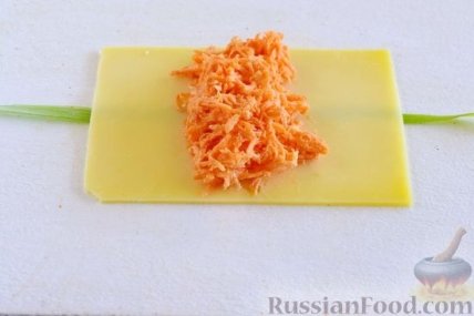 5. Теперь будем делать рулетики. На разделочную доску выкладываем перо зеленого лука, сверху на него кладем пластину сыра, как показано на фото.