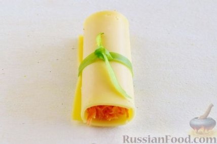 7. Скручиваем рулетик удобным вам способом - либо скручиваем трубочку, начиная с одного края, либо соединяем оба края сыра вверху. Я делала по первому варианту. При помощи перышка лука закрепляем рулетик из сыра. Повторяем этот процесс с оставшимися ингредиентами.