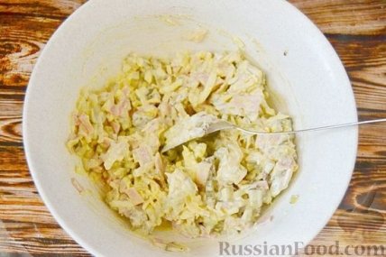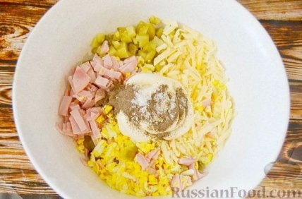 4 В глубоком салатнике соединим ветчину, огурцы, яйца и сыр.