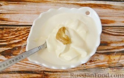 2 Приготовим заправку для салата. Для этого смешаем вместе горчицу, йогурт и майонез.