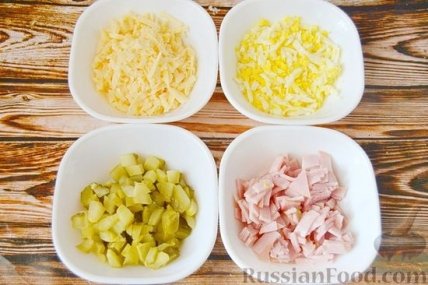 3 Ветчину нарежем мелкими кубиками. Сыр и яйца по отдельности натрем на крупной терке. Огурчики нарежем мелкими кубиками.