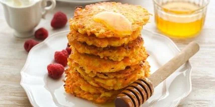 Яблочные драники готовы. Подавайте драники к столу горячими, дополнив медом или присыпав сахарной пудрой.