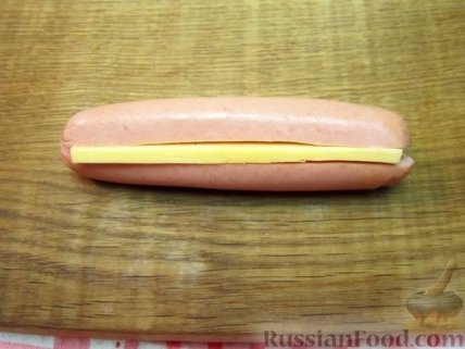 4 Между двумя половинками сосиски вкладываем кусочек сыра.