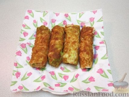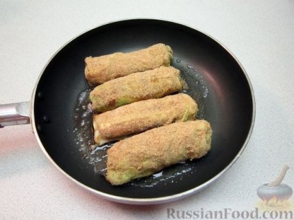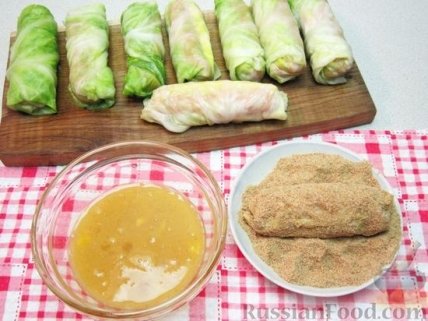 12 Окунаем каждый голубец с сосисками и сыром в яичную смесь. Затем обваливаем в панировочных сухарях.