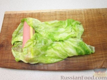 5 У капустного листа отрезаем толстую часть и кладем на него сосиску с сыром.