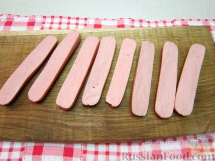3 Каждую сосиску разрезаем вдоль на 2 половинки.