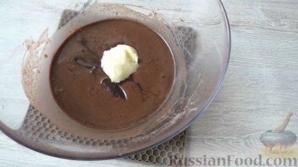 10 Добавляем шоколад и сливочное масло. На минуту отправляем в микроволновку. Периодически достаем и хорошо перемешиваем.