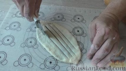 14 Пирожок с шоколадной начинкой раскатываем в небольшую лепешку. Не затрагивая края, разрезаем лепешку с шоколадной начинкой на полоски.