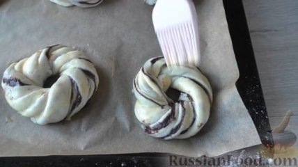 17 Выкладываем булочки на противень, застеленный пергаментом. Даем булочкам несколько минут постоять, пока духовка разогревается до 180 градусов. Перед выпечкой смазываем булочки желтком, смешанным с молоком.