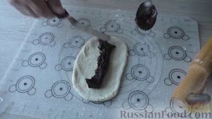 12 Тесто делим на шесть равных частей и округляем. Даем колобкам теста полежать на столе под пленкой минут 10. После чего присыпаем заготовку теста мукой и раскатываем в длинную лепешку, в центр которой выкладываем 1 ст. ложку шоколадной начинки.