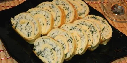 Замечательный рулет! Особенно он порадует любителей сыра. Очень нежный, с яично-сырным вкусом.