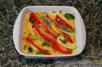 8 Залейте овощи яичной смесью. Запекайте в разогретой до 180 градусов духовке около 30 минут. Ориентируйтесь на желаемую степень прожарки омлета.