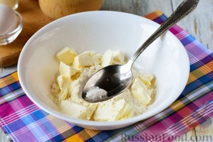 1 Смешать в миске муку, немного соли и нарезанное кусочками холодное сливочное масло.