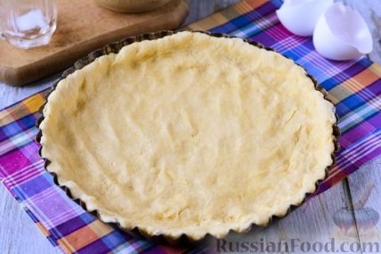 5 Распределить руками тесто по дну формы (у меня форма диаметром 22 см). Толщина теста примерно 0,5-0,7 см. Поставить форму с тестом в холодильник на 30 минут.