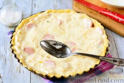 11 Залить пирог с сосисками заливкой, слегка разровнять, чтобы жидкая масса покрыла все сосиски. Поставить пирог запекаться в духовку, разогретую до 180 градусов.