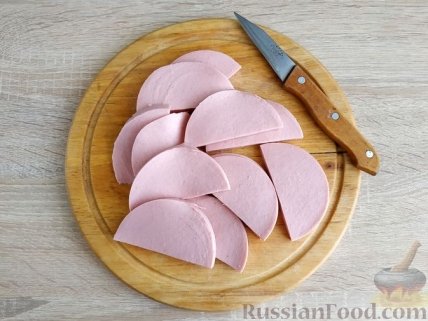 1 Вареную колбасу нарежьте тоненькими кружочками, затем каждый из них разрежьте еще пополам.