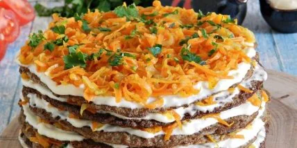11 Верхний блин также смазать майонезом, выложить морковь с луком и петрушку. Убрать печеночный торт в холодильник для пропитывания на 2-3 часа.